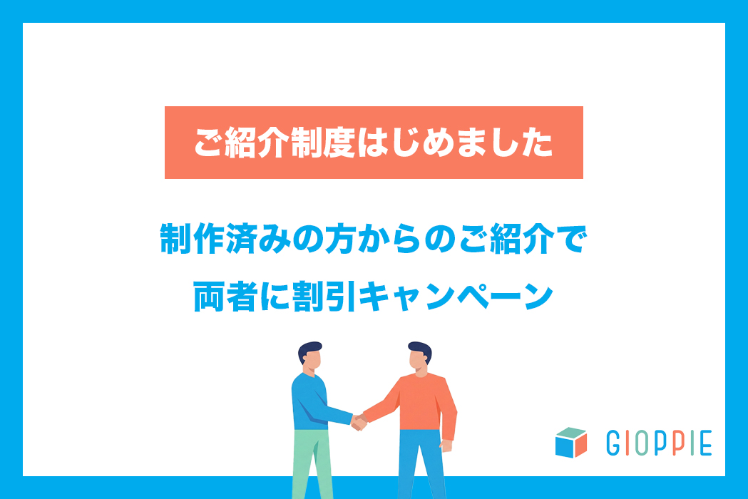 この度、ご紹介制度をはじめました。これまでにGioppie(ジョッピー)でホームページを制作して頂いたお客様のご紹介経由で、新規のお客様がお申し込みいただきますと、ご紹介制度が適用可能です。